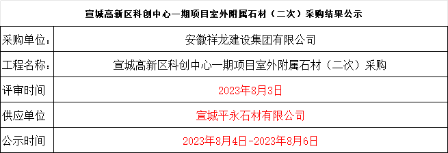 宣城高新區科創中心一期項目室外附屬石材(二次)采購結果公示